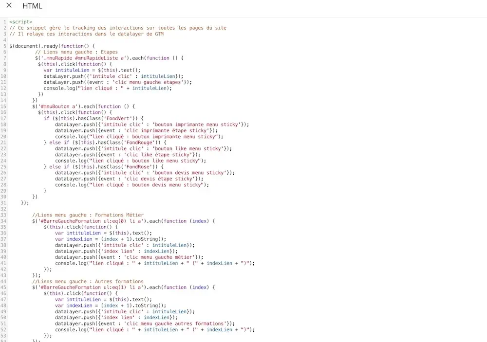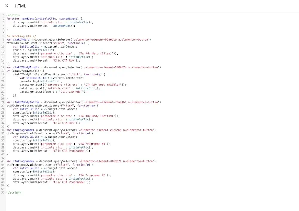 Après avoir défini quels KPI suivre et les éléments à tracker sur un plan de marquage, j'ai créé un custom Event Listener afin de collecter les interactions des utilisateurs pour les relayer dans GA et créer des objectifs de conversion. Exemples :