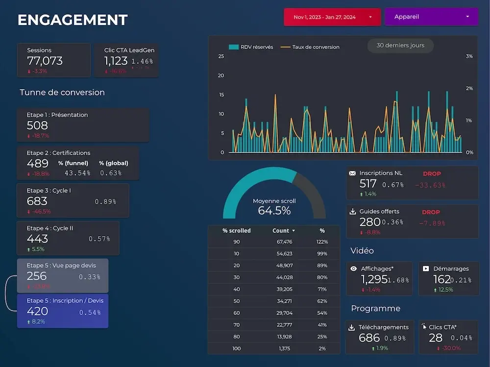 Cette mission s'est déroulée en deux temps : l'implémentation du tracking (GTM) et de Lucky Orange (heatmaps + recordings) et la création du dahsboard sur Looker Studio.