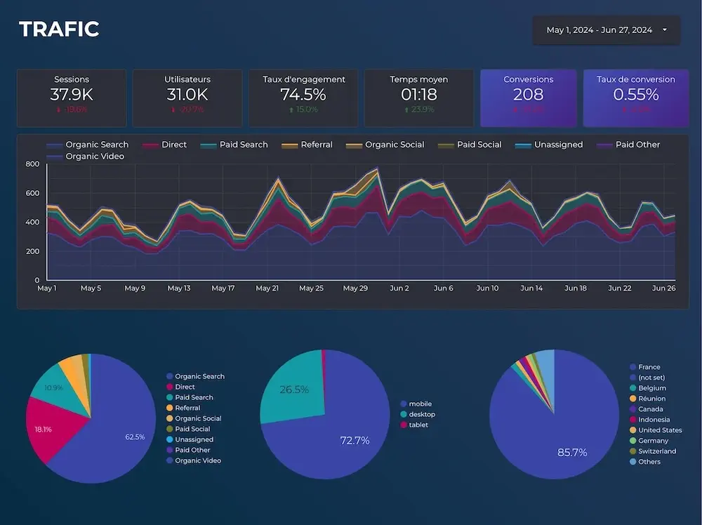 Le site est hébergé sur WordPress (Elementor) et comporte un blog d'une centaine d'article qui génèrent une partie non négligeable du trafic organique. La fondateur d'IR m'a chargé de lui créer un tableau de bord avec les principaux KPI et une vue sur le tunnel de conversion en vue de lui fournir des recommandations UX sur le parcours utilisateurs.