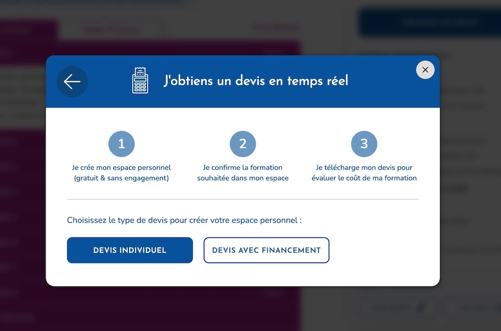 Sur le site, le tunnel de conversion se fait en 5 étapes : présentation de la formation, certification, cycle 1, cycle 2, page devis. Le nouveau template devait donc réunir toutes les informations nécessaires et permettre à l'utilisateur de s'inscrire ou de demander un devis. Une évaluation heuristique était