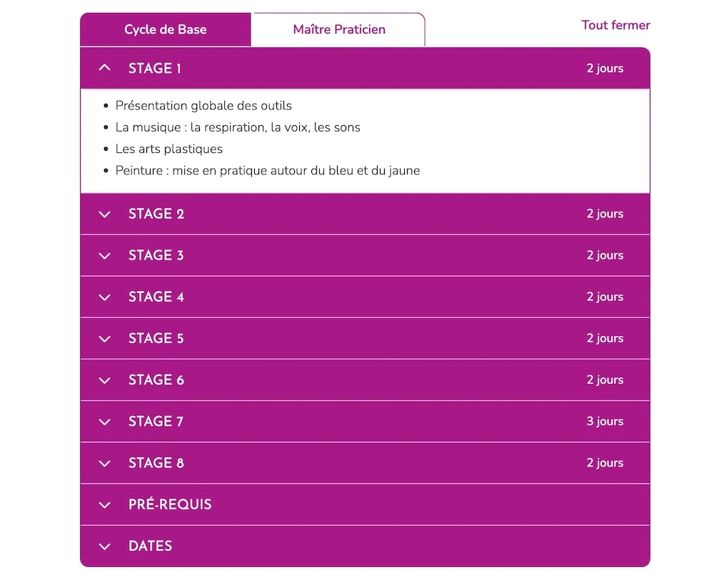 Ayant eu carte blanche quant au design général de cette page, j'ai choisi de présenter les webinaires sous la forme de cartes extensibles : au clic, la carte se déploie pour donner plus d'informations à l'utilisateur et lui permettre de s'inscrire.