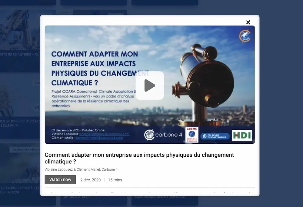 Le template final que j'ai proposé à fait l'unanimité tant au sein de l'équipe Pollutec que du côté utilisateurs. D'autres plateformes de webinaires avaient été déployées par RX mais dans un design assez sommaire (généralement un page avec des bullet points pour chaque contenu sans forcément de visuels ou de CTA clairs).