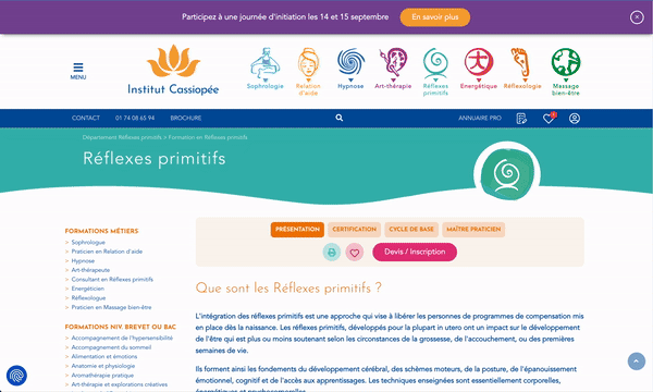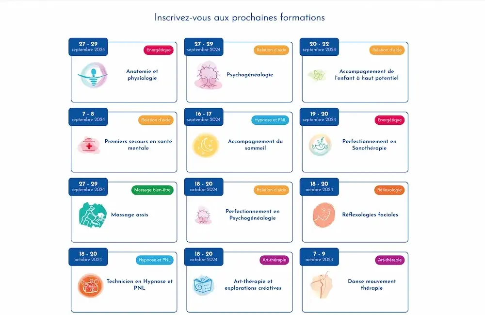 L'Institut Cassiopée est l'un des plus grands centres de formation en thérapie holistique. Plus de 50 formateurs proposent des formations certifiées dans de nombreuses disciplines : sophrologie, énergétique, art-thérapie, massage, sonothérapie...