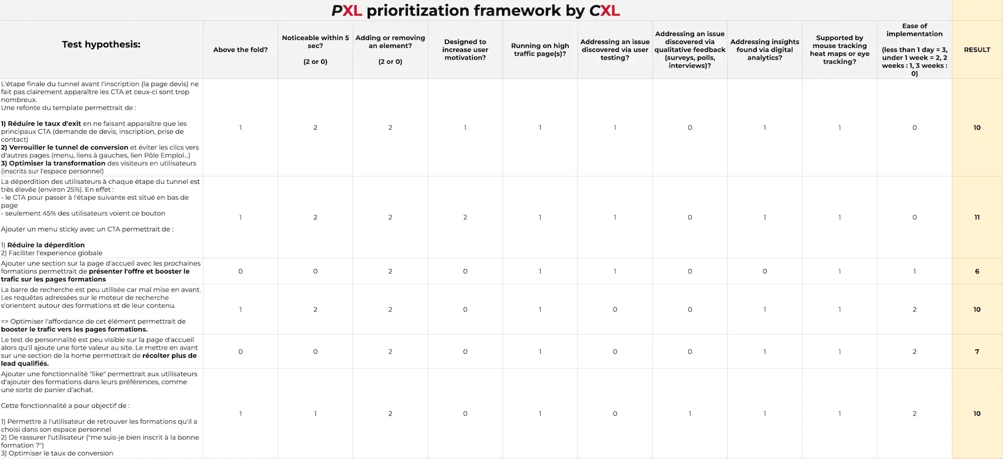 Une quizaine d'hypothèses a été listée et priorisées selon le framework PXL :
