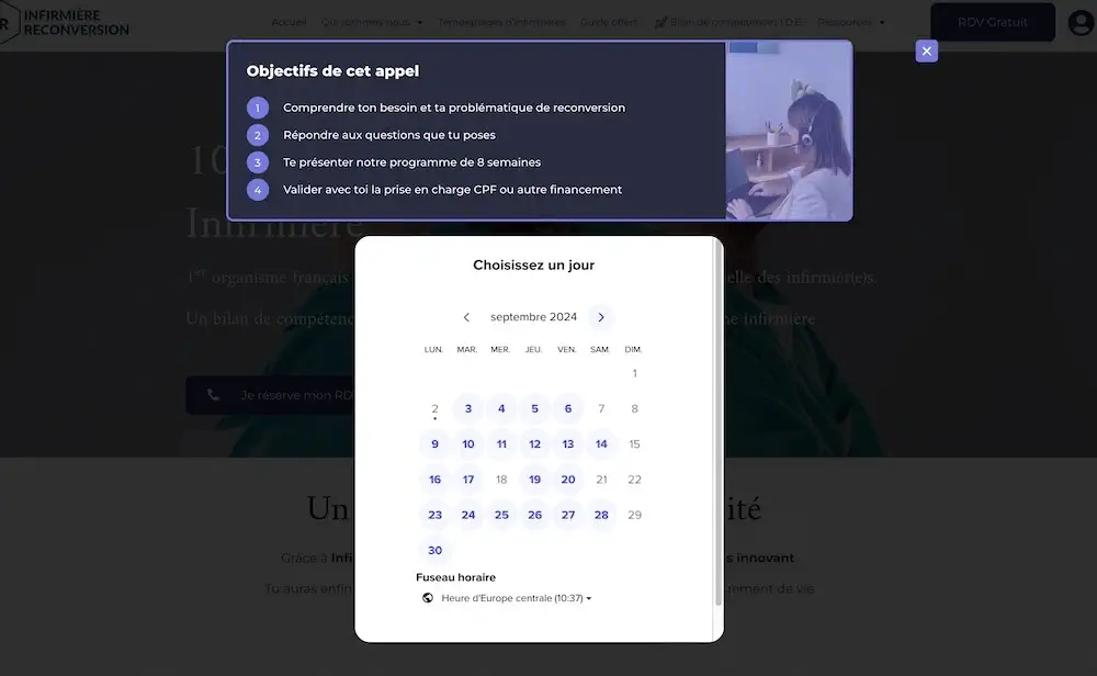 Après plusieurs itérations, la mécanique la plus efficace pour augmenter le taux de conversion fut d'implémenter un CTA dans le bloc Hero de la home page (70% du trafic) et dans le menu. Plutôt que de rediriger les utilisateurs sur la page "prise de rendez-vous", j'ai intégré le formulaire Calendly dans une pop-up. Celui-ci apparaît après avoir coché plusieurs mentions.