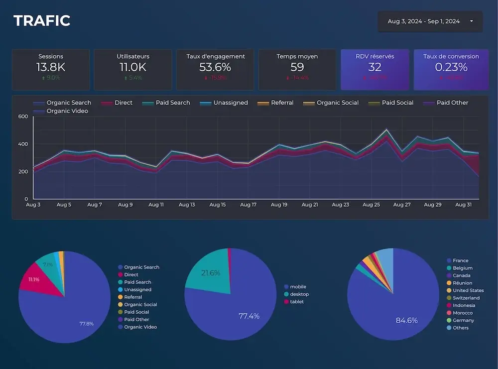 Le dashboard a été sur Looker Studio, de nombreuses metrics ont dû être aggrégées avec des champs calculés et certains connecteurs ont dû être mis en place afin de retrouver les bonnes données (notamment celles de Meta Ads).
